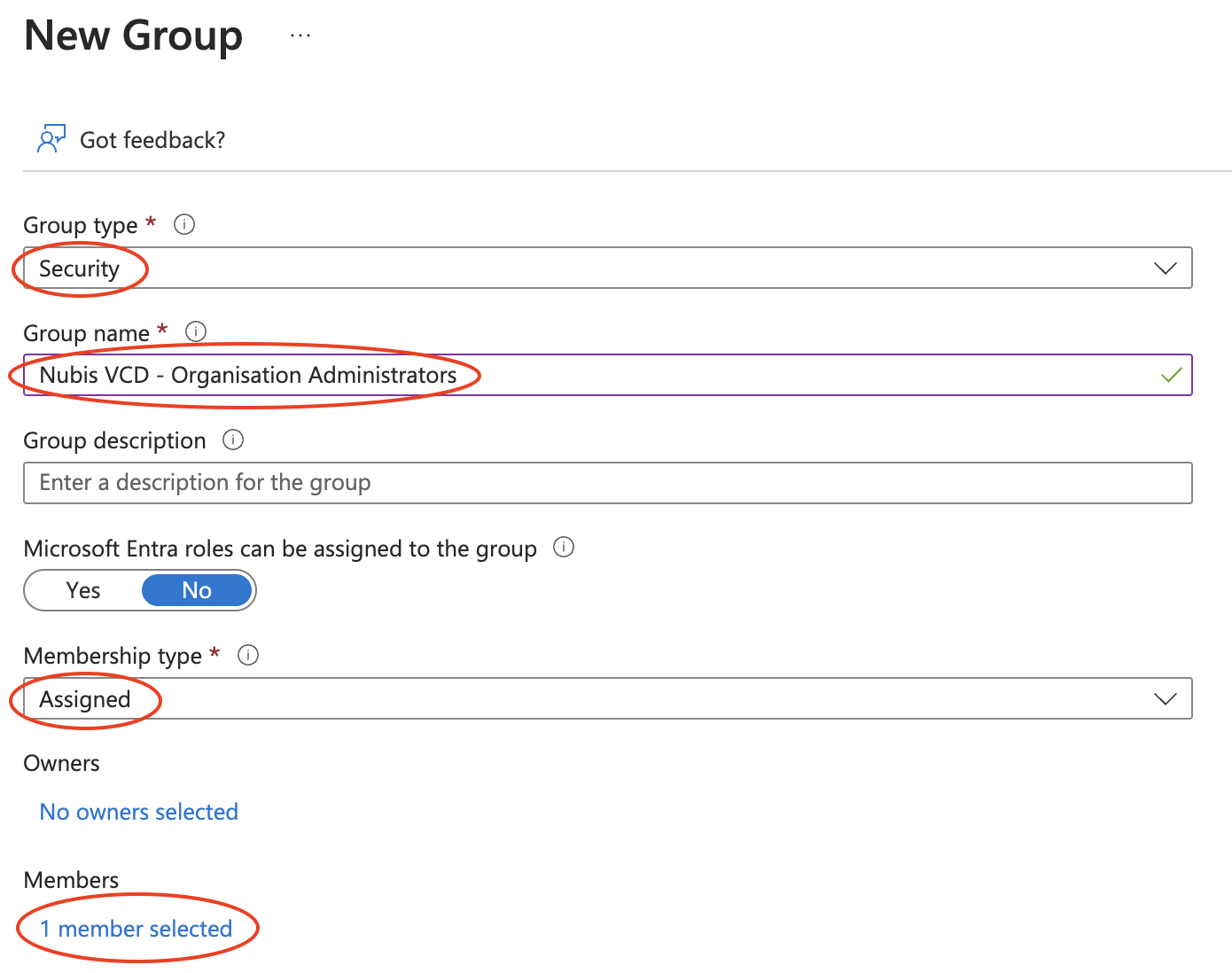 2. Select New group - here, we are creating a group called Nubis VCD - Organisation Administrators. Ensure the group type is set to Security and add any required members.