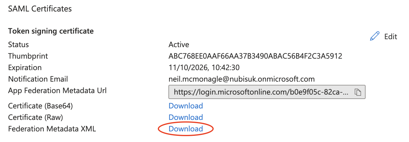 10. Return to your application Single sign-on page (under Manage). Scroll down to section 3 - SAML Certificates. Alongside Federation Metadata XML, use the Download option to download an XML configuration to your device: