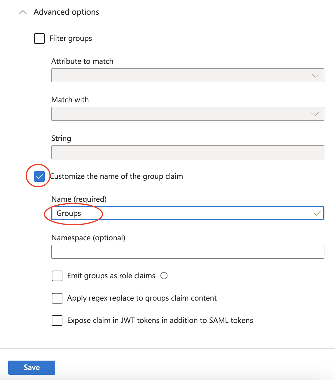 Expand the Advanced options section and check Customise the name of the group claim. Under Name, enter Groups (case sensitive). Press Save.