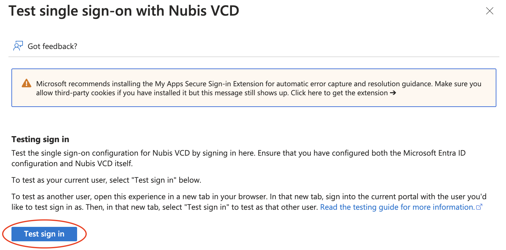 3. On the test page that appears, read the information provided and then press the Test sign in button. If you have completed the integration successfully (and are signed into Entra ID as a user which has been provided with access to your VCD tenant portal, via security group membership), your VCD tenant portal will open in a new tab.