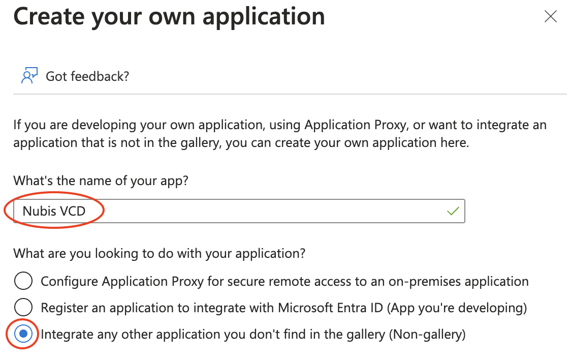3. Provide a name for your application (we are creating an app called Nubis VCD) and select the Non-gallery application type option: