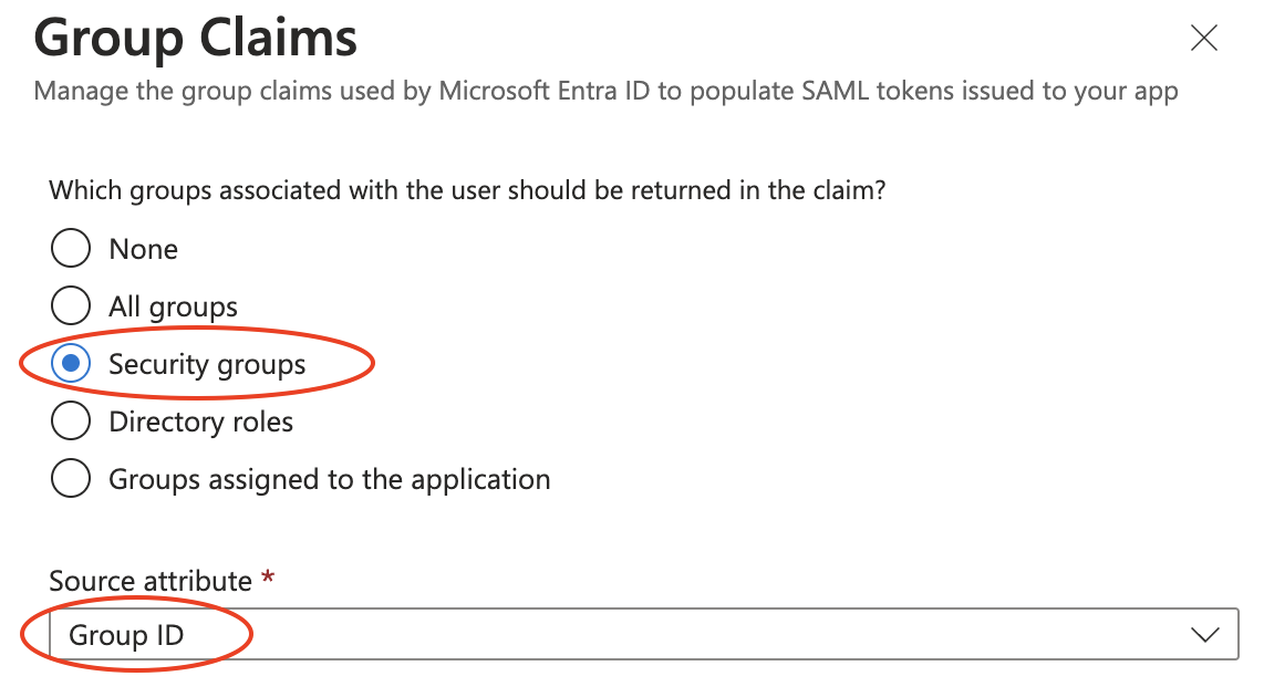 9. On the Group Claims page, select Security groups. Leave source attribute set to Group ID: